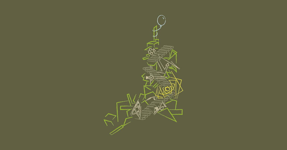 The three sets of stairs represent his different deployments and their duration in months, the spiral symbolizes the inner turmoil he continues to suffer due