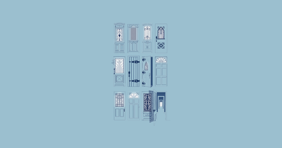 Her design represents life’s journey. Each door is a symbol of her ever changing life, including the door knob changing orientation to accommodate her lost