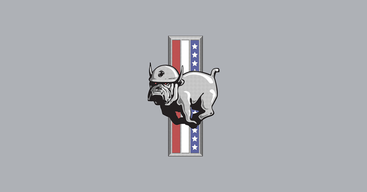 Inspired by the Ford Mustang he once drove, this midrun Bulldog from a vintage WWII Marines poster was combined with the American muscle car logo