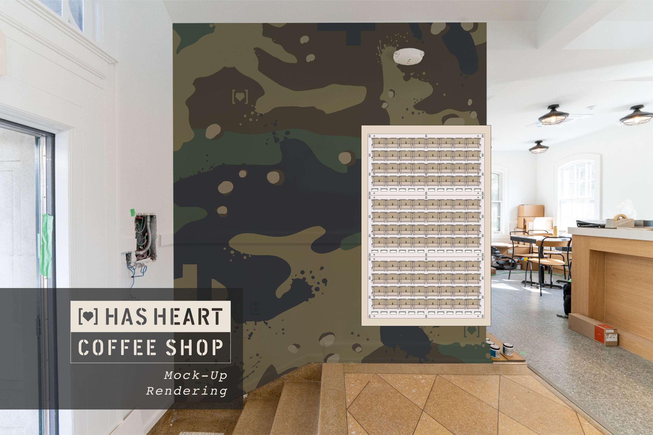 We’re excited to work with Mathile Design Co. (who helped bring our shadow box table concept to life, as seen in Update 04) to create a custom decal organizer to be mounted on our camo mural wall.