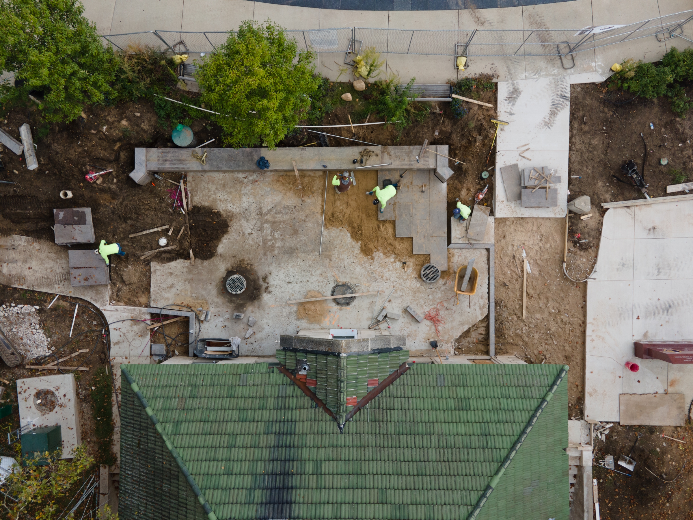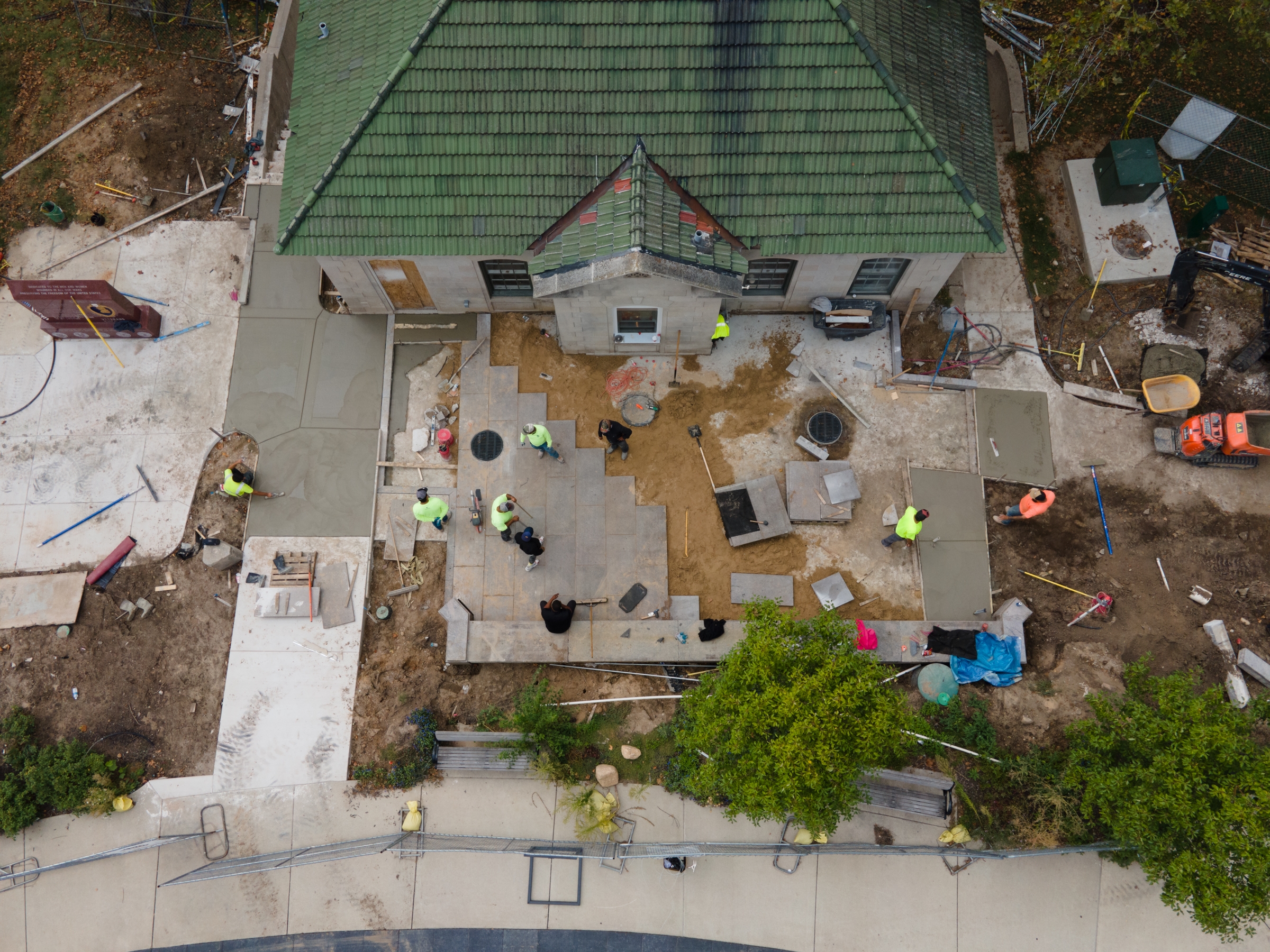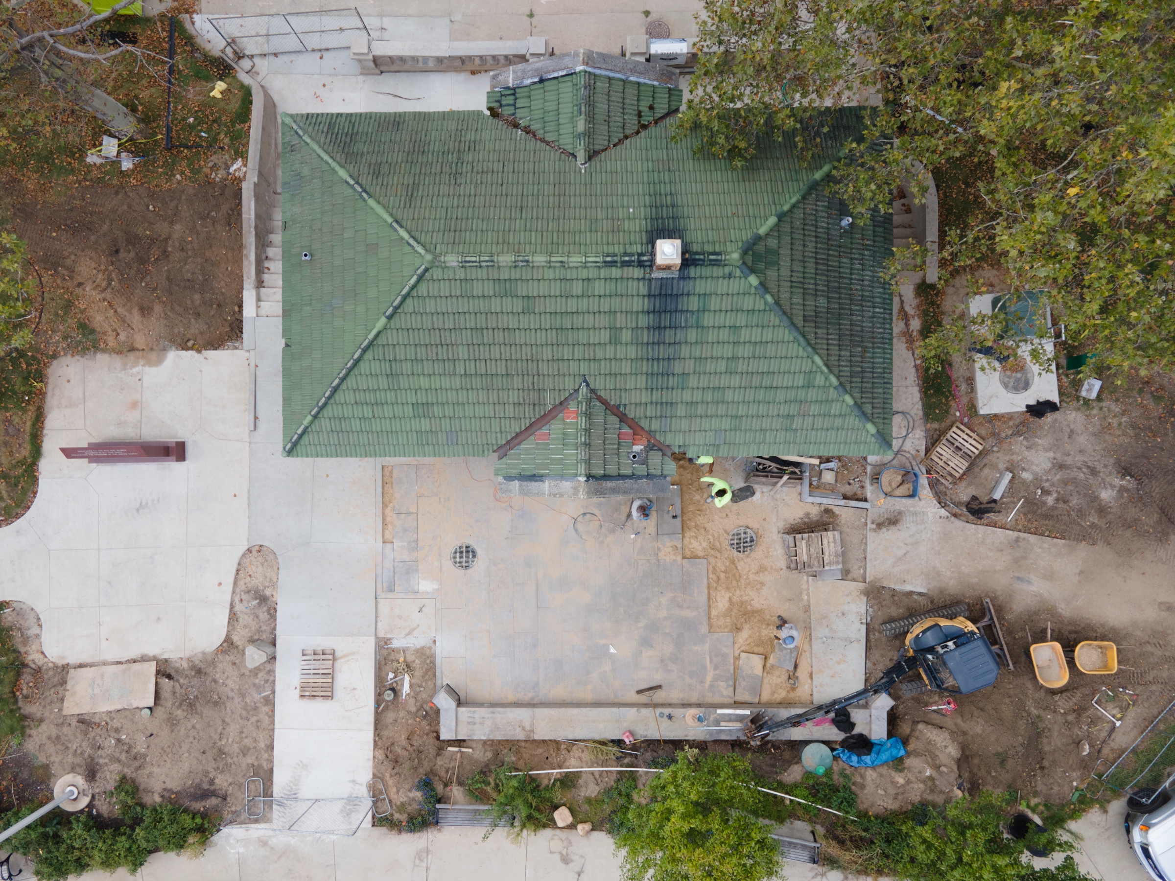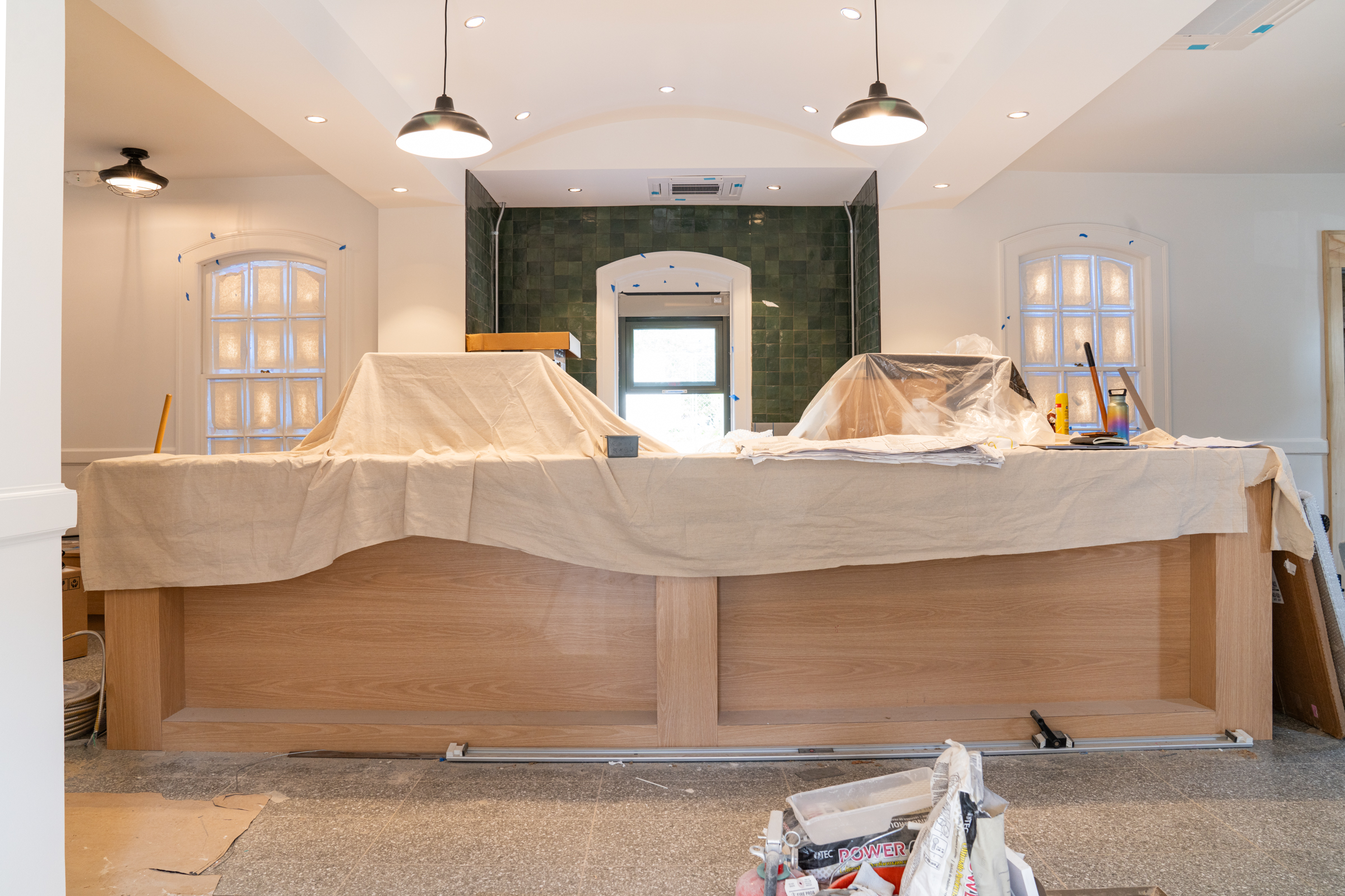 Over the past couple of weeks, the exterior patio has been being finished with the re-purposed granite from the old Veterans Memorial Park fountain that was originally built in the 1920s. The crews had the difficult task of gently placing these blocks of heavy pavers, but their hard work will pay off once the back patio is filled with folks sitting along the bench, around the outdoor tables, and ordering at the walk-up window.