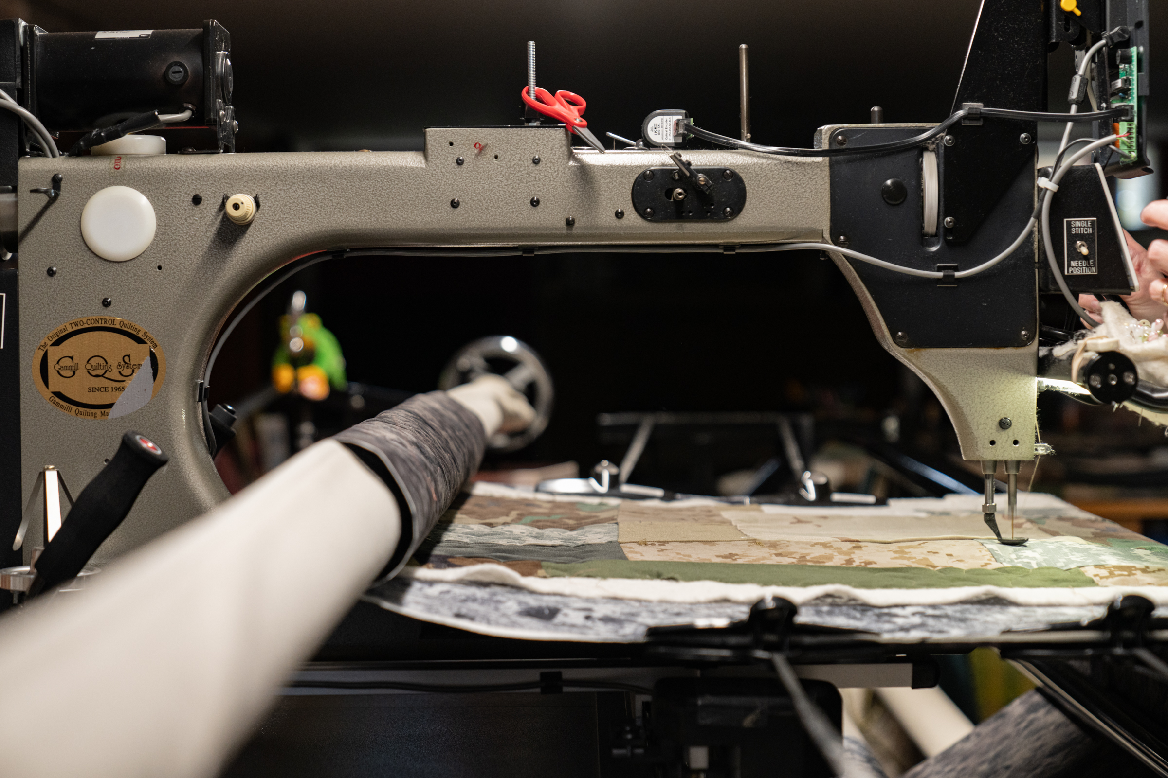 We then took nearly 10 yards of fabric to a local quilter to ensure greater durability of the cushions and add some extra layers of comfort. After she was done crafting a freehand meandering stitch on her long-arm quilter, the quilted fabric was taken to another woman in the Grand Rapids area to upholster them into the finished bench cushions — you’ll have to come in and see/try them!