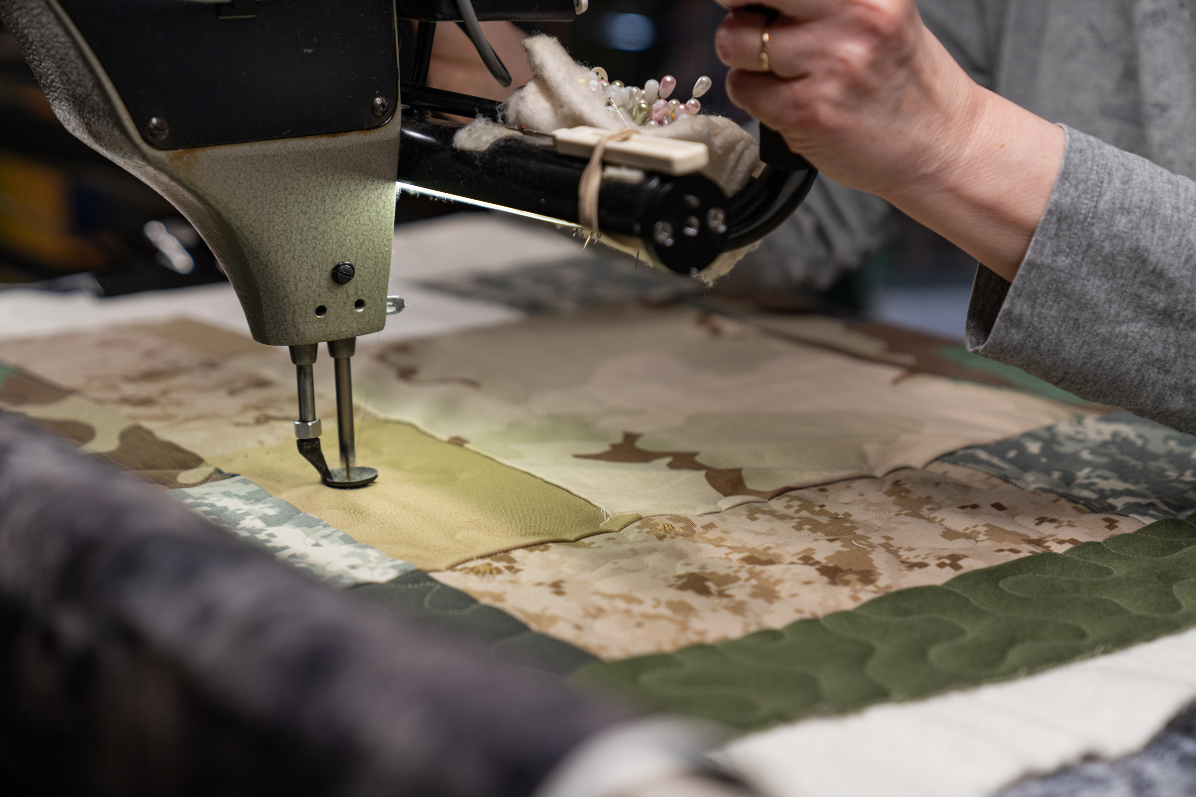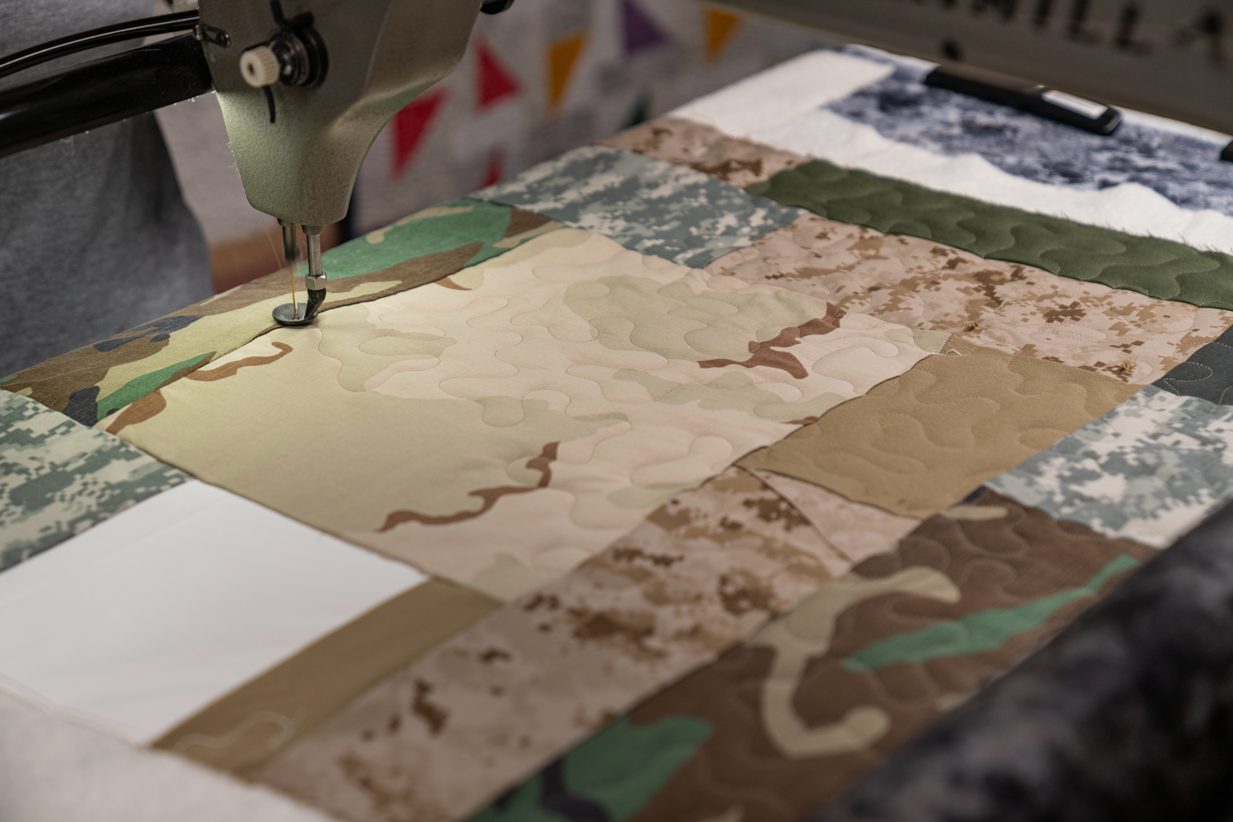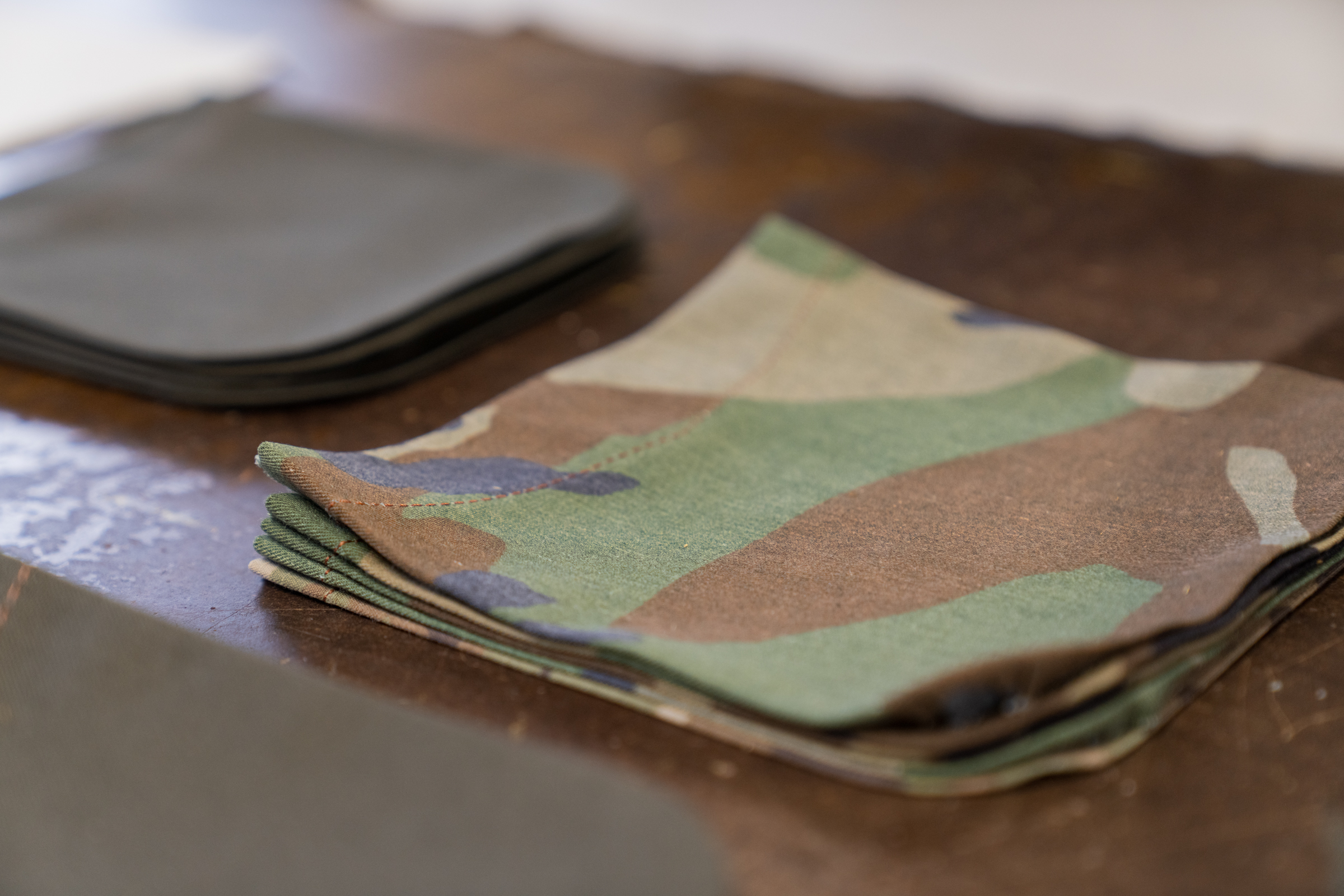 Remember the “Camo Campaign” we first launched in June, asking for donated uniforms to be dropped off at Sheldon Cleaners’ Laundry Room locations in Grand Rapids? After Sheldon Cleaners washed and folded all of those uniforms, we spent a fun “Craft Night” with our friends at Treetops Collective to cut and sew them into reusable fabric.