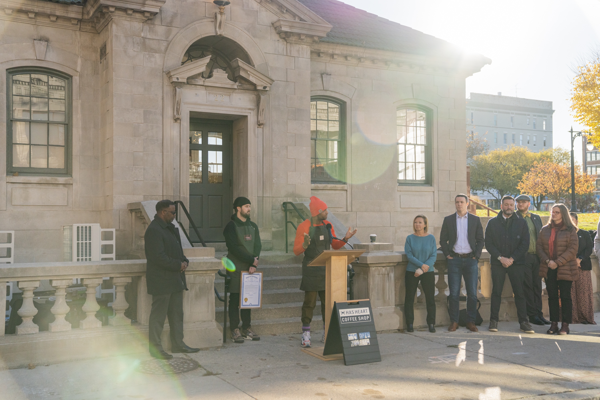 13 years after our founders met over a cup of coffee, 1 year after the “breaking ground” event, after 9 months of construction, and two days after our soft-opening on Veterans Day, the HAS HEART Coffee Shop is officially OPEN for business within the historic building on the grounds of Veterans Memorial Park in downtown Grand Rapids, MI.